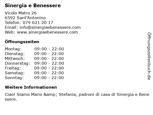 | Öffnungszeiten Sinergia e Benessere in Sant'Antonino anzeigen | |
