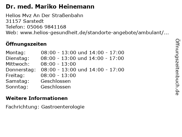 | Öffnungszeiten Dr. med. Mariko Heinemann in Sarstedt anzeigen | |