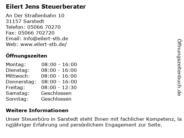 | Öffnungszeiten Eilert Jens Steuerberater in Sarstedt anzeigen | |