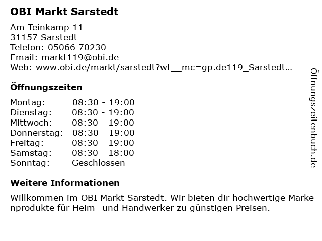 Hinweis: Willkommen im OBI Markt Sarstedt. Wir bieten dir hochwertige Markenprodukte für Heim- und Handwerker zu günstigen Preisen.