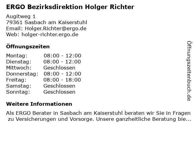 | Öffnungszeiten ERGO Bezirksdirektion Holger Richter in Sasbach am Kaiserstuhl anzeigen | |