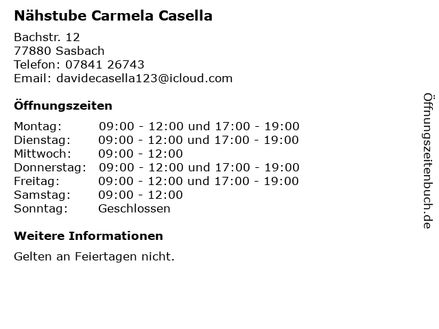 | Öffnungszeiten Nähstube Carmela Casella in Sasbach anzeigen | |