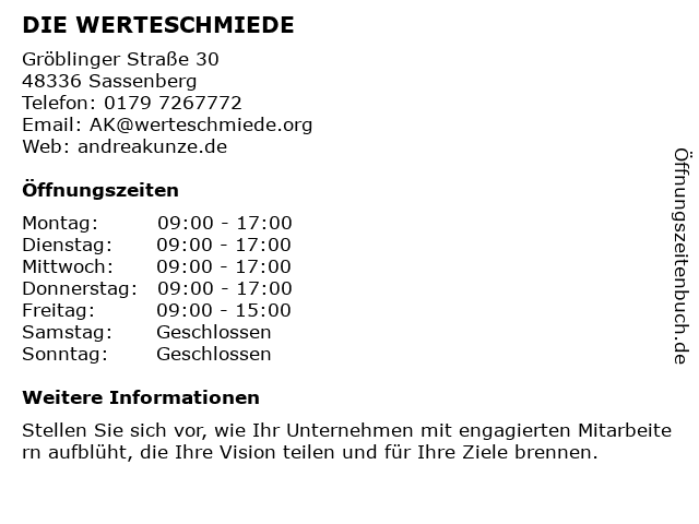 | Öffnungszeiten DIE WERTESCHMIEDE in Sassenberg anzeigen | |