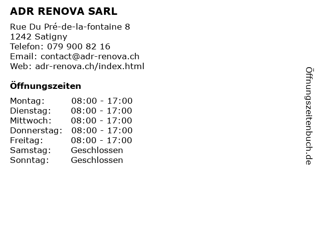 | Öffnungszeiten ADR RENOVA SARL in Satigny anzeigen | |