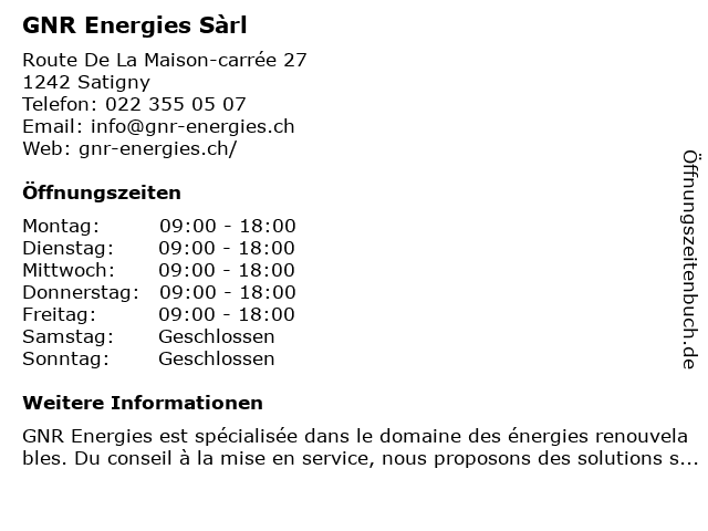 | Öffnungszeiten GNR Energies Sàrl in Satigny anzeigen | |