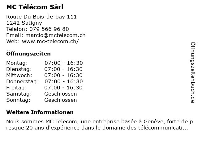 | Öffnungszeiten MC Télécom Sàrl in Satigny anzeigen | |