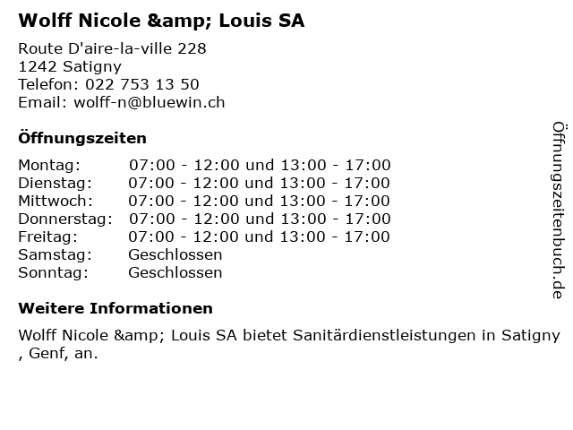 | Öffnungszeiten Wolff Nicole & Louis SA in Satigny anzeigen | |