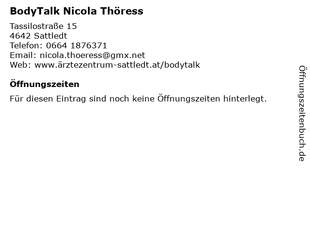 | Öffnungszeiten BodyTalk Nicola Thöress in Sattledt anzeigen | |