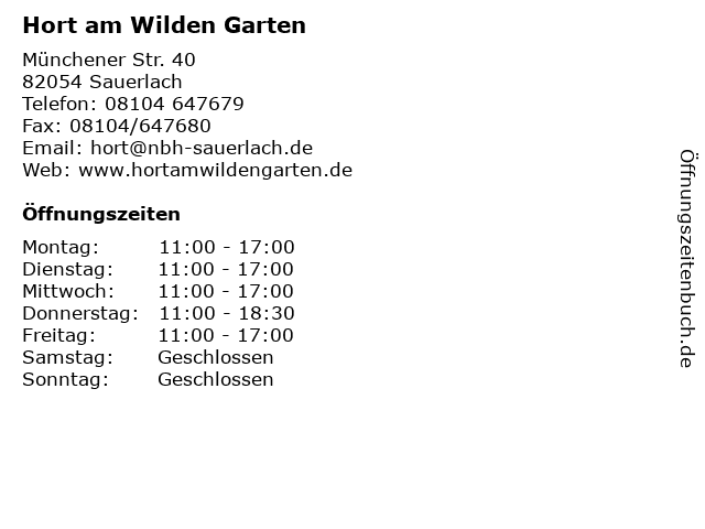 | Öffnungszeiten Hort am Wilden Garten in Sauerlach anzeigen | |