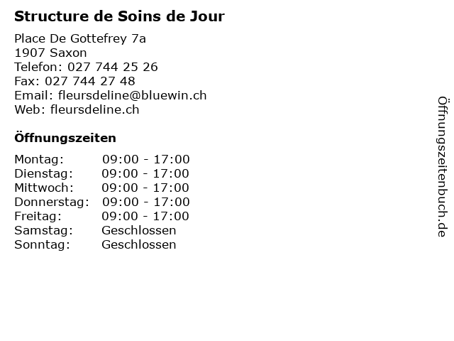 | Öffnungszeiten Structure de Soins de Jour in Saxon anzeigen | |