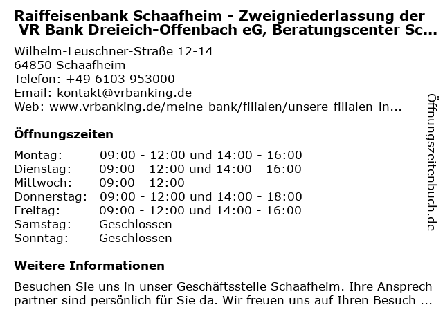 Branchen & Suchbegriffe zu Raiffeisenbank Schaafheim - Zweigniederlassung der VR Bank Dreieich-Offenbach eG, Beratungscenter Schaafheim:altersvorsorge, bank, baufinanzierung, beratungscenter, eg, geldanlage, geldautomat, genossenschaftliche beratung, genossenschaftsbank, girokonto, kontoauszugsdrucker, kredit, münzeinzahler, raiffeisenbank, schaafheim, versicherungen, vr, zweigniederlassung |