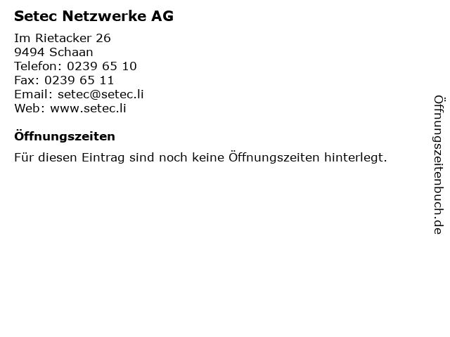 | Öffnungszeiten Setec Netzwerke AG in Schaan anzeigen | |