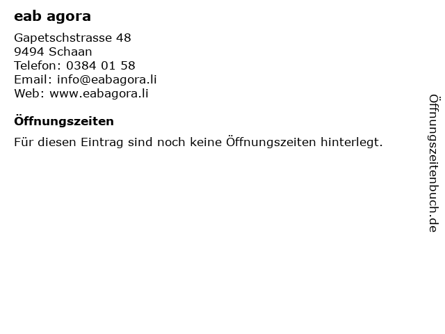 | Öffnungszeiten eab agora in Schaan anzeigen | |