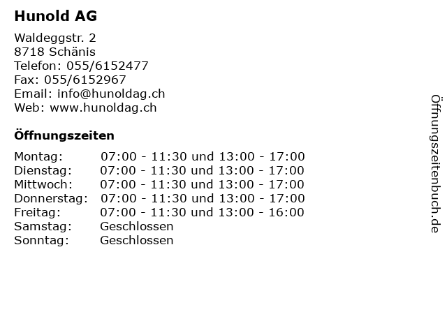 | Öffnungszeiten Hunold AG in Schänis anzeigen | |