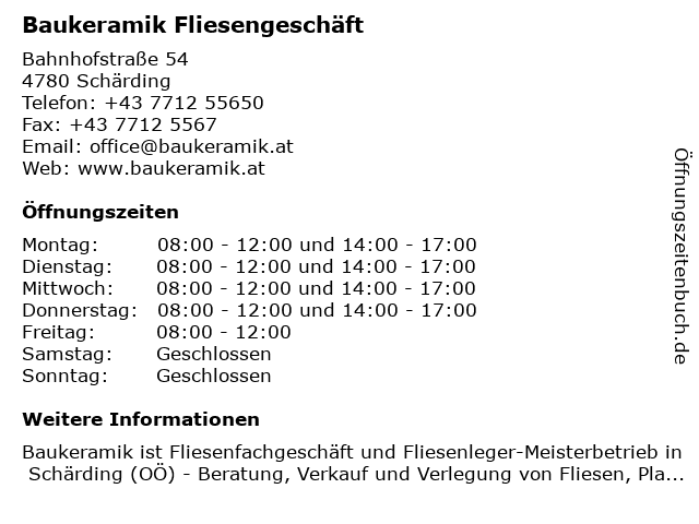 | Öffnungszeiten Baukeramik Fliesengeschäft in Schärding anzeigen | |