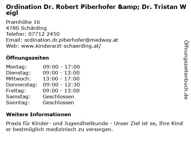 1 Piberhofer Robert Dr FA f Kinder- und Jugendheilkunde (Entfernung: 0,01 km) Pramhöhe 16, 4780 Schärding 6 |