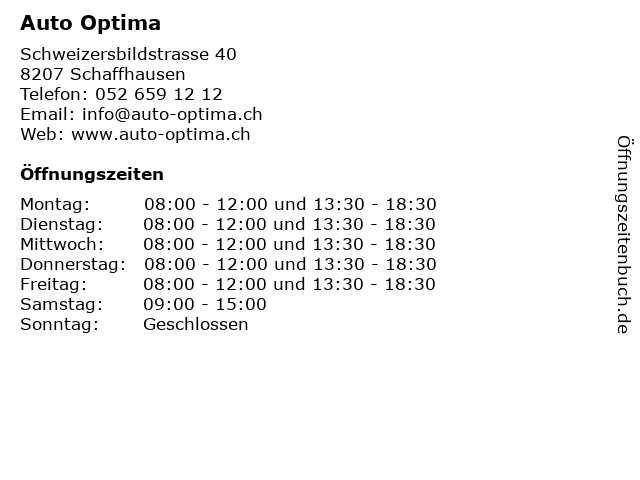 | Öffnungszeiten Auto Optima in Schaffhausen anzeigen | |