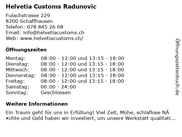Branchen & Suchbegriffe zu Helvetia Customs Radunovic:autohändler, autoteile und -zubehör, customs, gerätereparaturdienst, geschäft für autoreifen, helvetia, karosseriewerkstatt, radunovic |