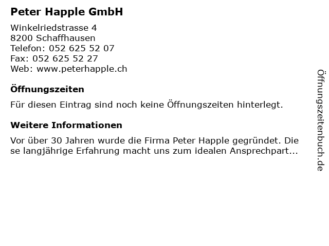 | Öffnungszeiten Peter Happle GmbH in Schaffhausen anzeigen | |