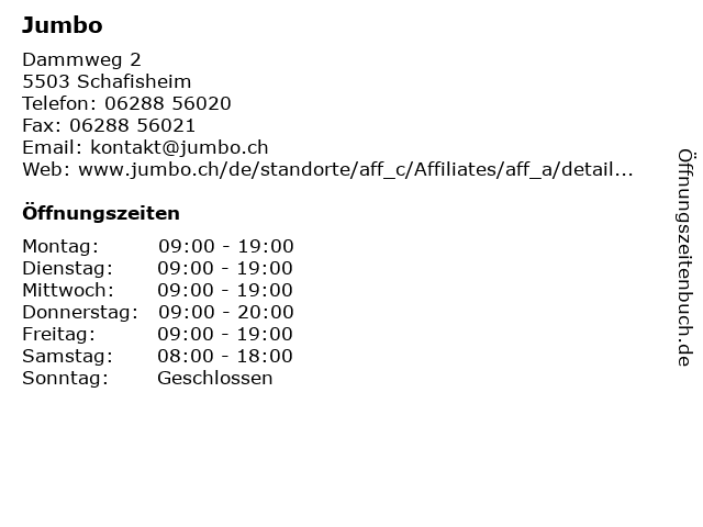 | Öffnungszeiten Jumbo in Schafisheim anzeigen | |