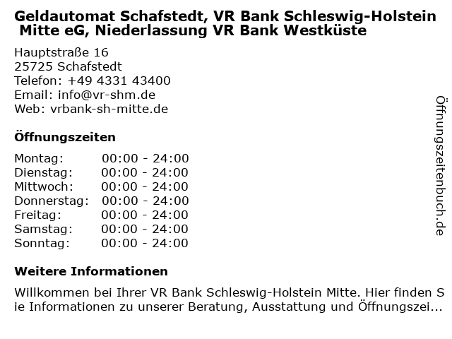 Branchen & Suchbegriffe zu Geldautomat Schafstedt, VR Bank Schleswig-Holstein Mitte eG, Niederlassung VR Bank Westküste:bank, eg, geldautomat, holstein, mitte, niederlassung, schafstedt, vr, westküste |
