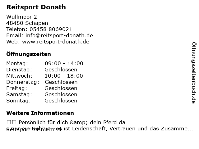 | Öffnungszeiten Reitsport Donath in Schapen anzeigen | |