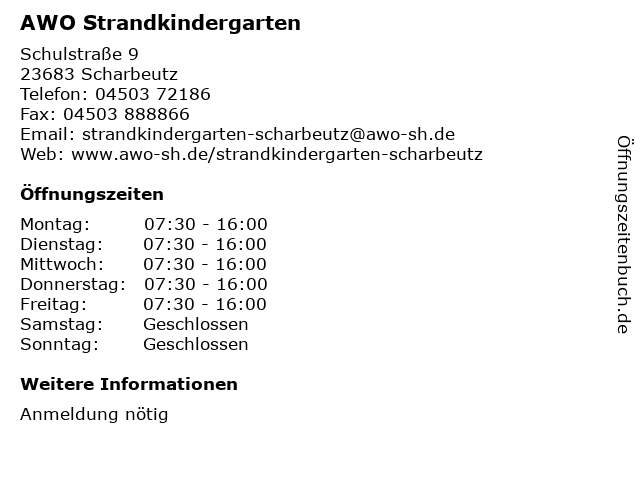 | Öffnungszeiten AWO Strandkindergarten in Scharbeutz anzeigen | |