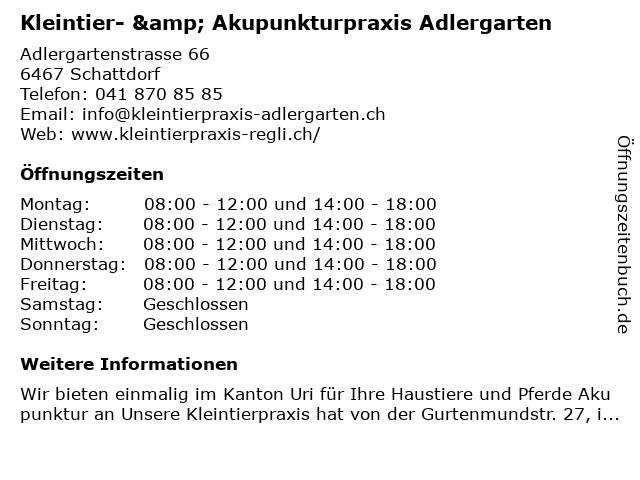 1 Kleintier- & Akupunkturpraxis Adlergarten (Entfernung: 0,01 km) Adlergartenstrasse 66, 6467 Schattdorf 3 Kleintier-& Akupunkturpraxis 'Am Bahnhofplatz' (Entfernung: 1,65 km) Gurtenmundstrasse 27, 6460 Altdorf UR 4 Winzap Tierärzte Kleintier AG | Notfalldienst nach Vereinbarung (Entfernung: 15,51 km) Gätzlistrasse 12, 6440 Brunnen 6 |