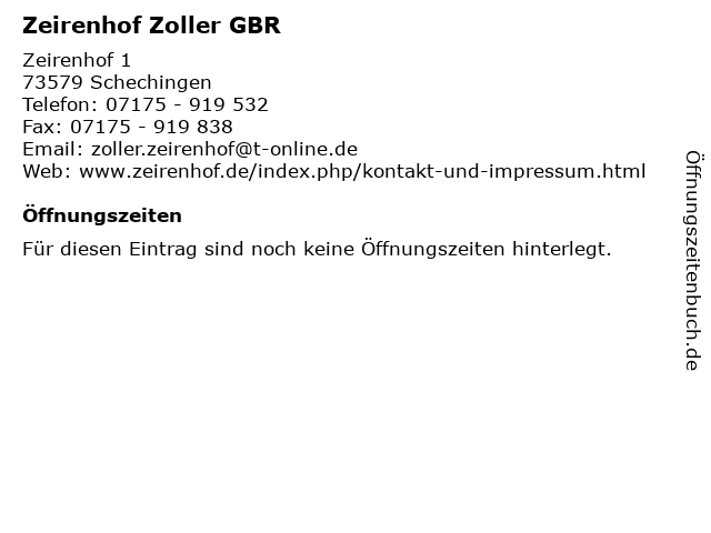 | Öffnungszeiten Zeirenhof Zoller GBR in Schechingen anzeigen | |