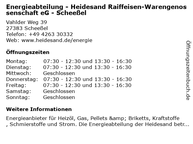 Branchen & Suchbegriffe zu Energieabteilung - Heidesand Raiffeisen-Warengenossenschaft eG - Scheeßel:eg, energie, energieabteilung, gas, heidesand, heizöl, pellets, raiffeisen, scheeßel, strom, warengenossenschaft |