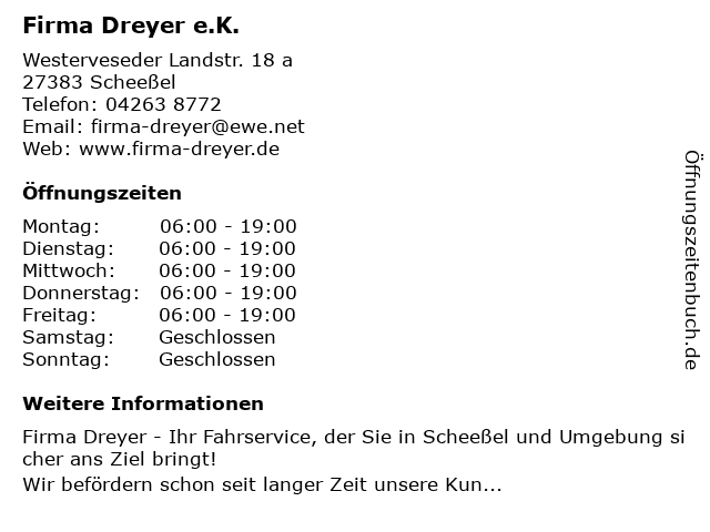| Öffnungszeiten Firma Dreyer e.K. in Scheeßel anzeigen | |