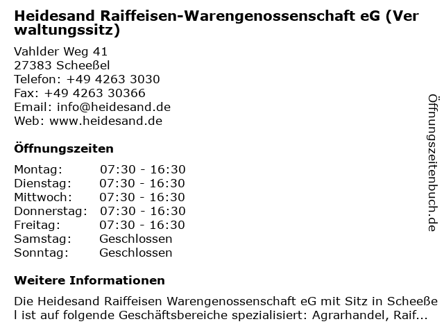 2 Heidesand Raiffeisen-Warengenossenschaft eG - Scheeßel (Entfernung: 0,12 km) Vahlder Weg 39, 27383 Scheeßel 3 Raiffeisen-Markt Rotenburg/Wümme - Heidesand RWG (Entfernung: 8,33 km) Auf dem Rusch 4a, 27356 Rotenburg (Wümme) 4 Heidesand Landhandel (Öffnungszeiten März-September) (Entfernung: 9,37 km) Am Bahnhof 2, 27386 Brockel 5 Heidesand Landhandel (Öffnungszeiten Oktober-Februar) (Entfernung: 9,37 km) Am Bahnhof 2, 27386 Brockel 6 Heidesand Raiffeisen-Warengenossenschaft eG - Waffensen (Entfernung: 12,69 km) Am Weißen Berge 11, 27367 Bötersen |