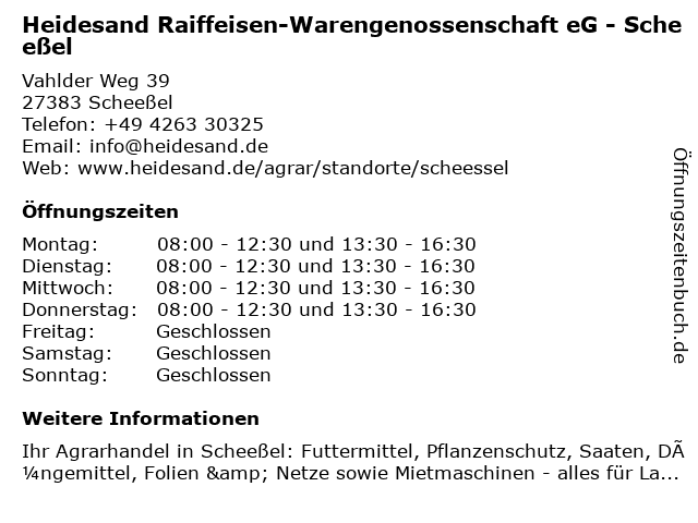 2 Heidesand Raiffeisen-Warengenossenschaft eG - Verwaltungssitz (Entfernung: 0,12 km) Vahlder Weg 41, 27383 Scheeßel 3 Raiffeisen-Markt Rotenburg/Wümme - Heidesand RWG (Entfernung: 8,28 km) Auf dem Rusch 4a, 27356 Rotenburg (Wümme) 4 Heidesand Landhandel (Öffnungszeiten März-September) (Entfernung: 9,42 km) Am Bahnhof 2, 27386 Brockel 5 Heidesand Landhandel (Öffnungszeiten Oktober-Februar) (Entfernung: 9,42 km) Am Bahnhof 2, 27386 Brockel 6 Heidesand Raiffeisen-Warengenossenschaft eG - Waffensen (Entfernung: 12,60 km) Am Weißen Berge 11, 27367 Bötersen |