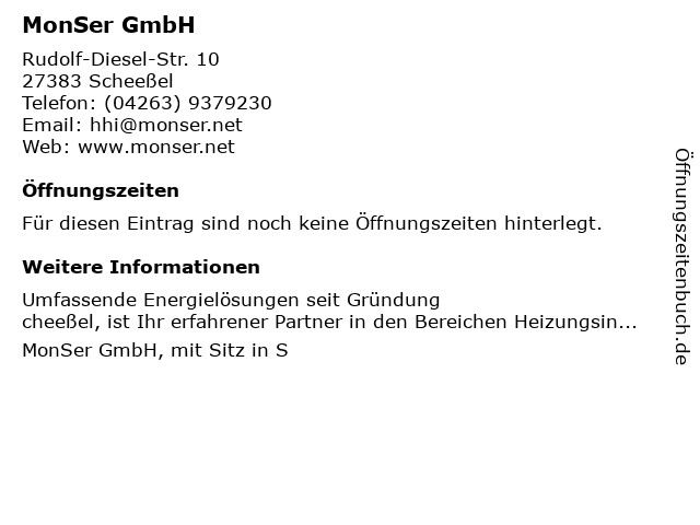 | Öffnungszeiten MonSer GmbH in Scheeßel anzeigen | |