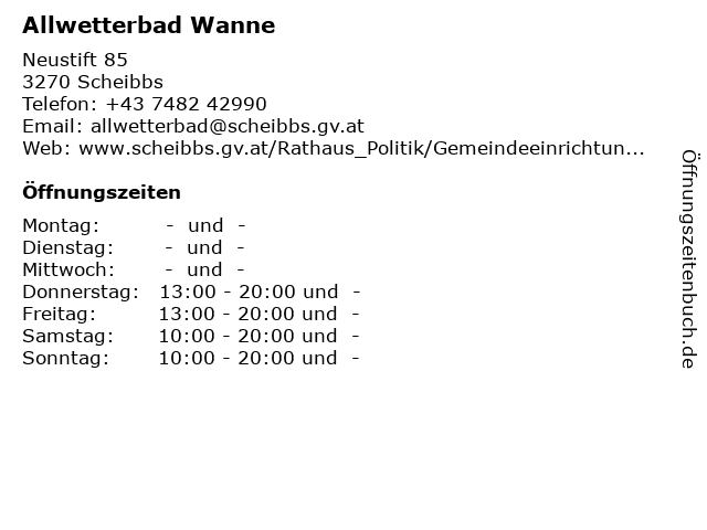 | Telefonnummer Allwetterbad Wanne in Scheibbs (+43 7482 42990) anrufen | |