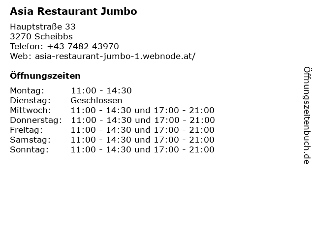 | Öffnungszeiten Asia Restaurant Jumbo in Scheibbs anzeigen | |