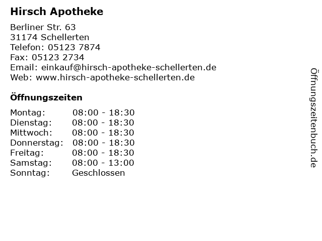 | Öffnungszeiten Hirsch Apotheke in Schellerten anzeigen | |