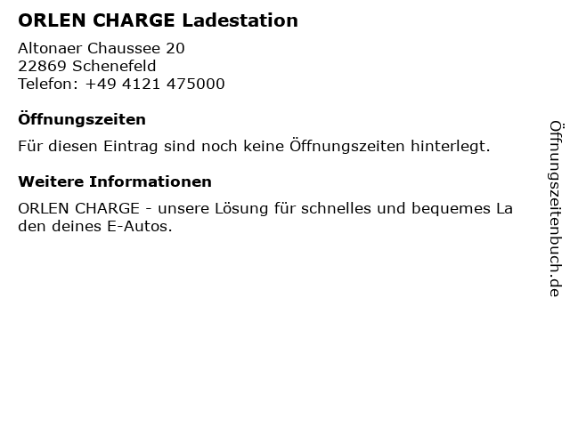 | Öffnungszeiten ORLEN CHARGE Ladestation in Schenefeld anzeigen | |
