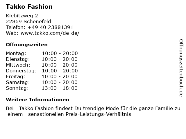 | Öffnungszeiten Takko Fashion in Schenefeld anzeigen | |