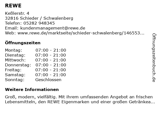 Hinweis: Groß, modern, vielfältig. Mit ihrem umfassenden Angebot an frischen Lebensmitteln, den REWE Eigenmarken und einer großen Getränkeauswahl, bieten REWE Supermärkte alles was Sie brauchen an einem Ort.
