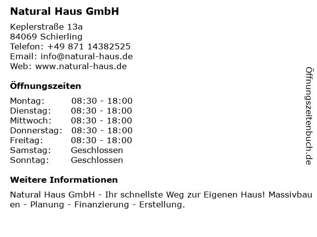 | Öffnungszeiten Natural Haus GmbH in Schierling anzeigen | |