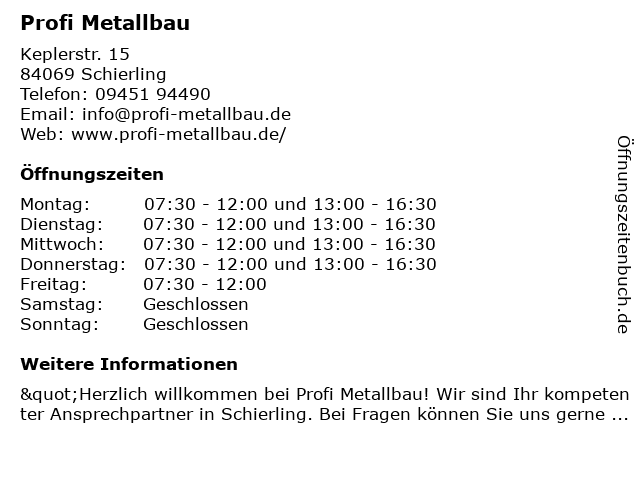 | Öffnungszeiten Profi Metallbau in Schierling anzeigen | |