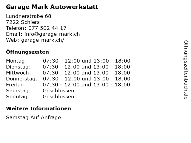 | Öffnungszeiten Garage Mark Autowerkstatt in Schiers anzeigen | |
