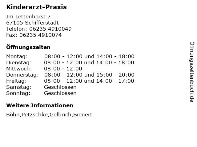| Öffnungszeiten Kinderarzt-Praxis in Schifferstadt anzeigen | |
