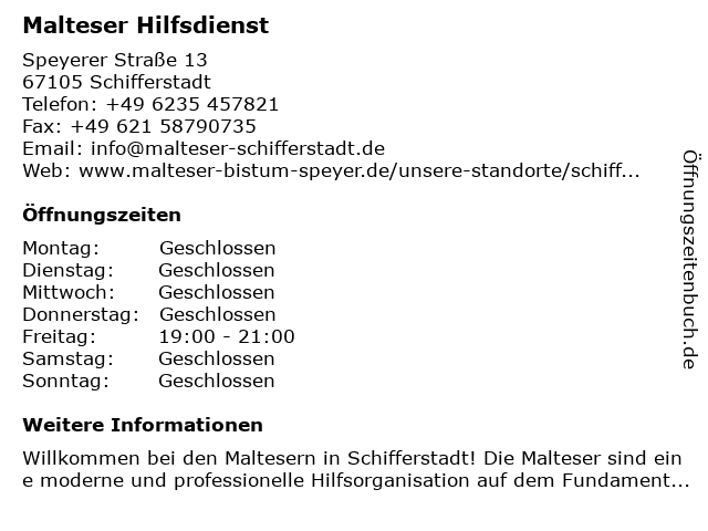 | Öffnungszeiten Malteser Hilfsdienst in Schifferstadt anzeigen | |