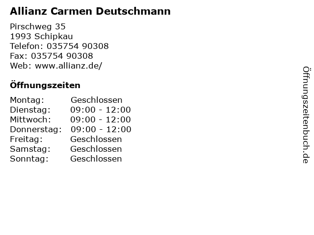 | Öffnungszeiten Allianz Carmen Deutschmann in Schipkau anzeigen | |