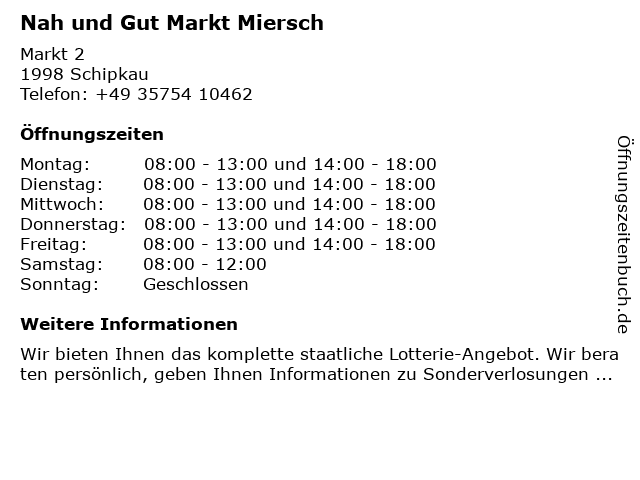| Öffnungszeiten Nah und Gut Markt Miersch in Schipkau anzeigen | |