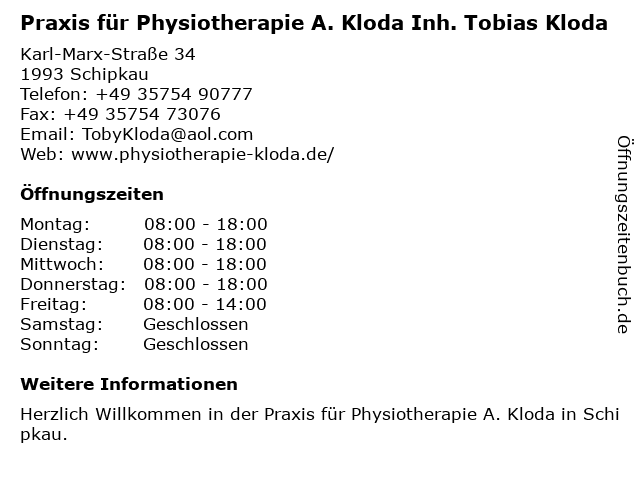 Branchen & Suchbegriffe zu Praxis für Physiotherapie A. Kloda Inh. Tobias Kloda:a., elektrotherapie, kloda, krankengymnastik, manuelle therapie, massage, physiotherapie, praxis, tobias |