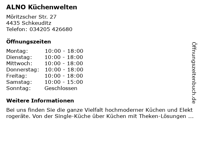 | Öffnungszeiten ALNO Küchenwelten in Schkeuditz anzeigen | |