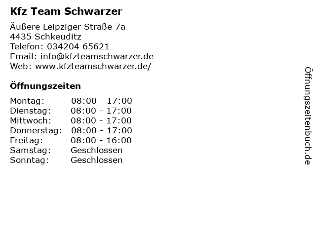| Öffnungszeiten Kfz Team Schwarzer in Schkeuditz anzeigen | |